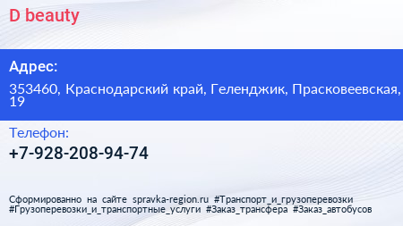 D-beauty по адресу 353460, Краснодарский край, Геленджик, Прасковеевская, 19 в дальнейшем Организация, размещена в следующих категориях: