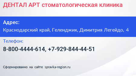 ДЕНТАЛ-АРТ, стоматологическая клиника по адресу Краснодарский край, Геленджик, Димитрия Легейдо, 4 в дальнейшем Организация, размещена в следующих категориях: