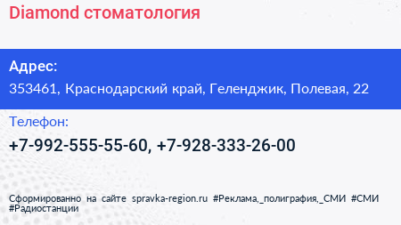 Diamond, стоматология по адресу 353461, Краснодарский край, Геленджик, Полевая, 22 в дальнейшем Организация, размещена в следующих категориях: