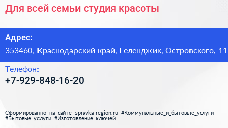 Для всей семьи, студия красоты по адресу 353460, Краснодарский край, Геленджик, Островского, 11 в дальнейшем Организация, размещена в следующих категориях: