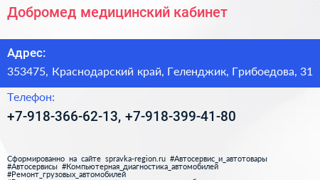Добромед, медицинский кабинет по адресу 353475, Краснодарский край, Геленджик, Грибоедова, 31 в дальнейшем Организация, размещена в следующих категориях: