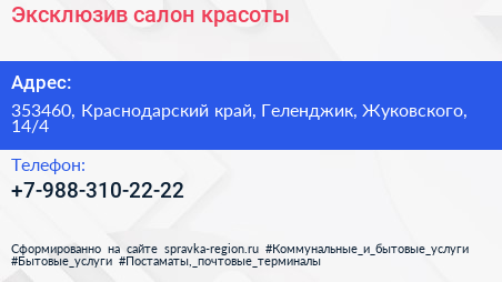 Эксклюзив, салон красоты по адресу 353460, Краснодарский край, Геленджик, Жуковского, 14/4 в дальнейшем Организация, размещена в следующих категориях: