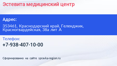 Эстевита, медицинский центр по адресу 353461, Краснодарский край, Геленджик, Красногвардейская, 38а лит А в дальнейшем Организация, размещена в следующих категориях: