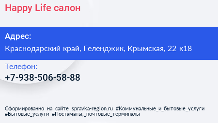 Happy Life, салон по адресу Краснодарский край, Геленджик, Крымская, 22 к18 в дальнейшем Организация, размещена в следующих категориях: