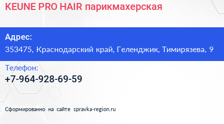 KEUNE PRO HAIR, парикмахерская по адресу 353475, Краснодарский край, Геленджик, Тимирязева, 9 в дальнейшем Организация, размещена в следующих категориях: