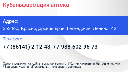 Кубаньфармация, аптека по адресу 353460, Краснодарский край, Геленджик, Ленина, 42 в дальнейшем Организация, размещена в следующих категориях: