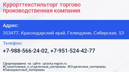 Курорттекстильторг, торгово-производственная компания по адресу 353477, Краснодарский край, Геленджик, Сибирская, 13 в дальнейшем Организация, размещена в следующих категориях: