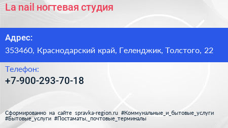La-nail, ногтевая студия по адресу 353460, Краснодарский край, Геленджик, Толстого, 22 в дальнейшем Организация, размещена в следующих категориях: