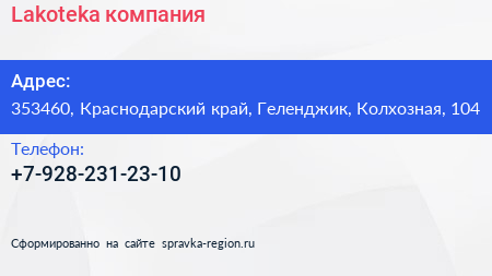 Lakoteka, компания по адресу 353460, Краснодарский край, Геленджик, Колхозная, 104 в дальнейшем Организация, размещена в следующих категориях: