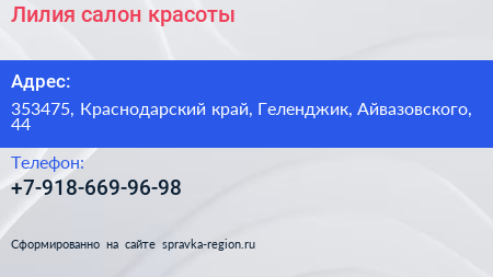 Лилия, салон красоты по адресу 353475, Краснодарский край, Геленджик, Айвазовского, 44 в дальнейшем Организация, размещена в следующих категориях: