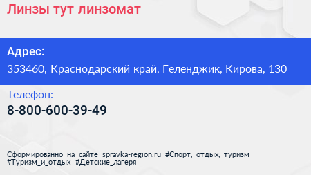Линзы-тут, линзомат по адресу 353460, Краснодарский край, Геленджик, Кирова, 130 в дальнейшем Организация, размещена в следующих категориях: