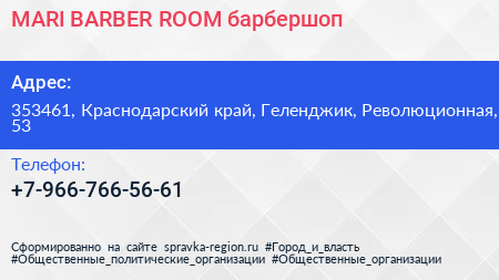 MARI BARBER ROOM, барбершоп по адресу 353461, Краснодарский край, Геленджик, Революционная, 53 в дальнейшем Организация, размещена в следующих категориях: