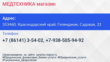 МЕДТЕХНИКА, магазин по адресу 353460, Краснодарский край, Геленджик, Садовая, 21 в дальнейшем Организация, размещена в следующих категориях: