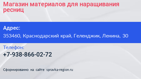 Магазин материалов для наращивания ресниц по адресу 353460, Краснодарский край, Геленджик, Ленина, 30 в дальнейшем Организация, размещена в следующих категориях:
