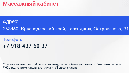 Массажный кабинет по адресу 353460, Краснодарский край, Геленджик, Островского, 31 в дальнейшем Организация, размещена в следующих категориях: