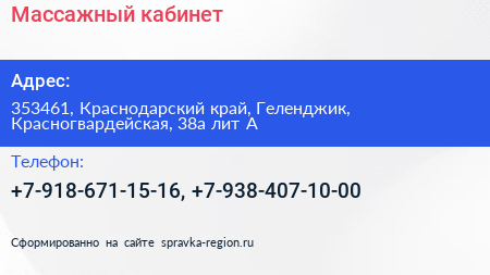 Массажный кабинет по адресу 353461, Краснодарский край, Геленджик, Красногвардейская, 38а лит А в дальнейшем Организация, размещена в следующих категориях: