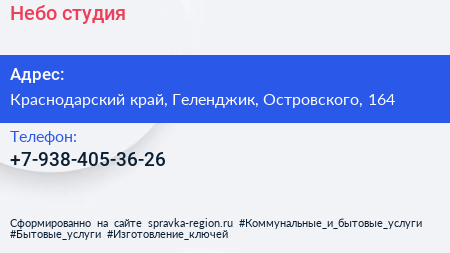 Небо, студия по адресу Краснодарский край, Геленджик, Островского, 164 в дальнейшем Организация, размещена в следующих категориях: