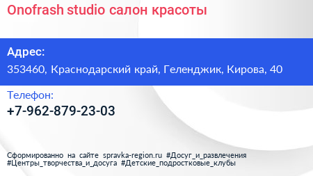 Onofrash studio, салон красоты по адресу 353460, Краснодарский край, Геленджик, Кирова, 40 в дальнейшем Организация, размещена в следующих категориях: