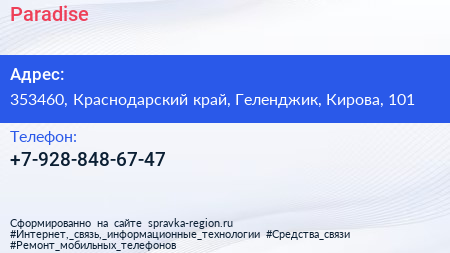 Paradise по адресу 353460, Краснодарский край, Геленджик, Кирова, 101 в дальнейшем Организация, размещена в следующих категориях: