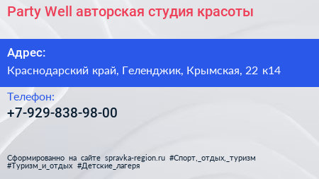 Party Well, авторская студия красоты по адресу Краснодарский край, Геленджик, Крымская, 22 к14 в дальнейшем Организация, размещена в следующих категориях: