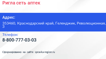 Ригла, сеть аптек по адресу 353460, Краснодарский край, Геленджик, Революционная, 3 в дальнейшем Организация, размещена в следующих категориях: