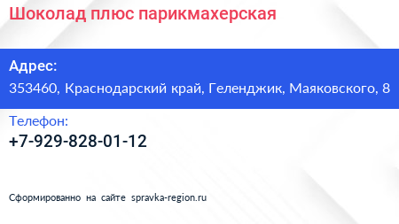 Шоколад плюс, парикмахерская по адресу 353460, Краснодарский край, Геленджик, Маяковского, 8 в дальнейшем Организация, размещена в следующих категориях: