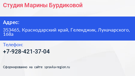 Студия Марины Бурдиковой по адресу 353465, Краснодарский край, Геленджик, Луначарского, 168а в дальнейшем Организация, размещена в следующих категориях:
