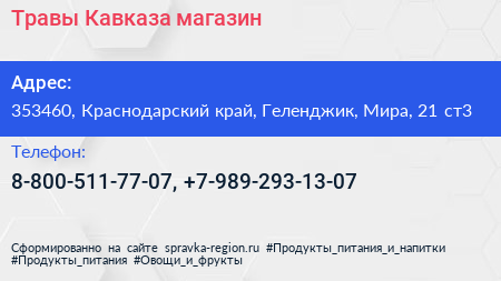 Травы Кавказа, магазин по адресу 353460, Краснодарский край, Геленджик, Мира, 21 ст3 в дальнейшем Организация, размещена в следующих категориях: