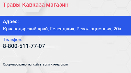 Травы Кавказа, магазин по адресу Краснодарский край, Геленджик, Революционная, 20а в дальнейшем Организация, размещена в следующих категориях: