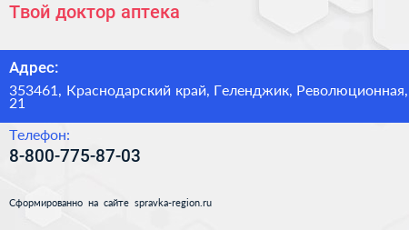 Твой доктор, аптека по адресу 353461, Краснодарский край, Геленджик, Революционная, 21 в дальнейшем Организация, размещена в следующих категориях: