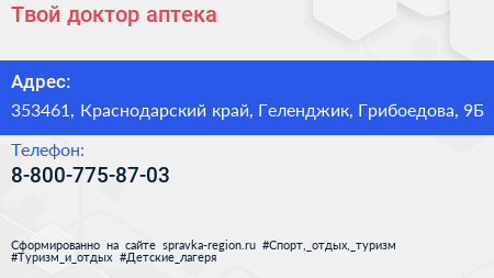 Твой доктор, аптека по адресу 353461, Краснодарский край, Геленджик, Грибоедова, 9Б в дальнейшем Организация, размещена в следующих категориях: