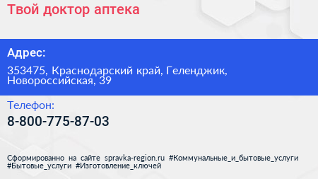 Твой доктор, аптека по адресу 353475, Краснодарский край, Геленджик, Новороссийская, 39 в дальнейшем Организация, размещена в следующих категориях:
