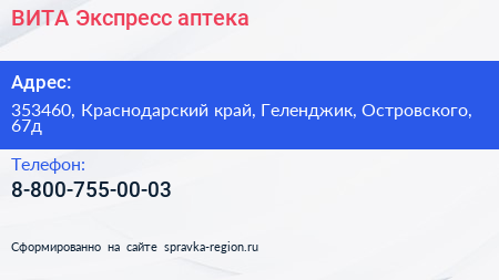 ВИТА Экспресс, аптека по адресу 353460, Краснодарский край, Геленджик, Островского, 67д в дальнейшем Организация, размещена в следующих категориях: