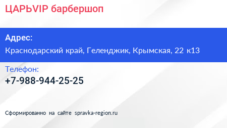ЦАРЬVIP, барбершоп по адресу Краснодарский край, Геленджик, Крымская, 22 к13 в дальнейшем Организация, размещена в следующих категориях: