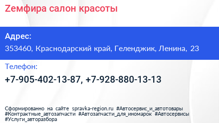 Zемфира, салон красоты по адресу 353460, Краснодарский край, Геленджик, Ленина, 23 в дальнейшем Организация, размещена в следующих категориях: