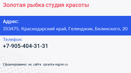 Золотая рыбка, студия красоты по адресу 353475, Краснодарский край, Геленджик, Белинского, 20 в дальнейшем Организация, размещена в следующих категориях: