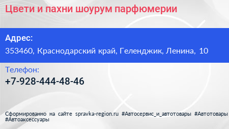 Цвети и пахни, шоурум парфюмерии по адресу 353460, Краснодарский край, Геленджик, Ленина, 10 в дальнейшем Организация, размещена в следующих категориях:
