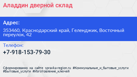 Аладдин, дверной склад по адресу 353460, Краснодарский край, Геленджик, Восточный переулок, 42 в дальнейшем Организация, размещена в следующих категориях: