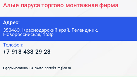 Алые паруса, торгово-монтажная фирма по адресу 353460, Краснодарский край, Геленджик, Новороссийская, 163р в дальнейшем Организация, размещена в следующих категориях: