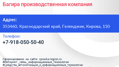 Багира, производственная компания по адресу 353460, Краснодарский край, Геленджик, Кирова, 150 в дальнейшем Организация, размещена в следующих категориях: