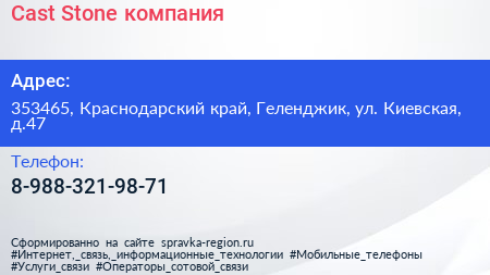 Cast Stone, компания по адресу 353465, Краснодарский край, Геленджик, ул. Киевская, д.47 в дальнейшем Организация, размещена в следующих категориях: