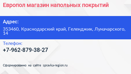 Европол, магазин напольных покрытий по адресу 353460, Краснодарский край, Геленджик, Луначарского, 14 в дальнейшем Организация, размещена в следующих категориях: