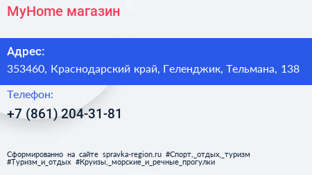 MyHome, магазин по адресу 353460, Краснодарский край, Геленджик, Тельмана, 138 в дальнейшем Организация, размещена в следующих категориях: