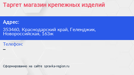 Таргет, магазин крепежных изделий по адресу 353460, Краснодарский край, Геленджик, Новороссийская, 163ж в дальнейшем Организация, размещена в следующих категориях: