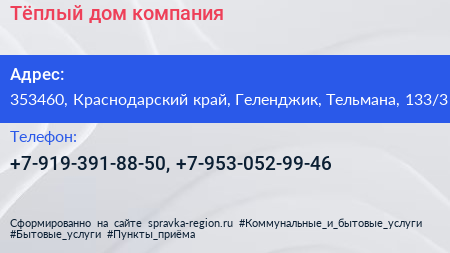 Тёплый дом, компания по адресу 353460, Краснодарский край, Геленджик, Тельмана, 133/3 в дальнейшем Организация, размещена в следующих категориях: