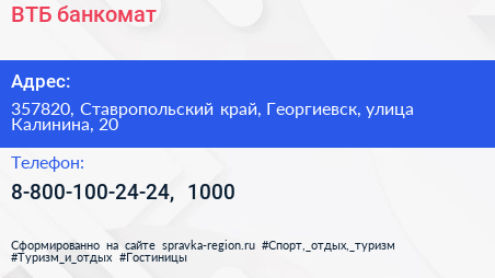 ВТБ, банкомат по адресу 357820, Ставропольский край, Георгиевск, улица Калинина, 20 в дальнейшем Организация, размещена в следующих категориях: