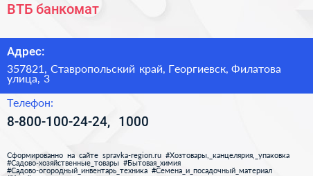 ВТБ, банкомат по адресу 357821, Ставропольский край, Георгиевск, Филатова улица, 3 в дальнейшем Организация, размещена в следующих категориях: