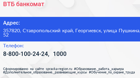 ВТБ, банкомат по адресу 357820, Ставропольский край, Георгиевск, улица Пушкина, 52 в дальнейшем Организация, размещена в следующих категориях: