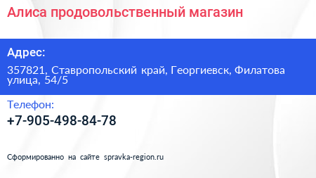 Алиса, продовольственный магазин по адресу 357821, Ставропольский край, Георгиевск, Филатова улица, 54/5 в дальнейшем Организация, размещена в следующих категориях: