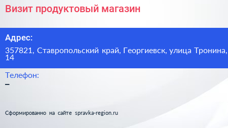 Визит, продуктовый магазин по адресу 357821, Ставропольский край, Георгиевск, улица Тронина, 14 в дальнейшем Организация, размещена в следующих категориях: